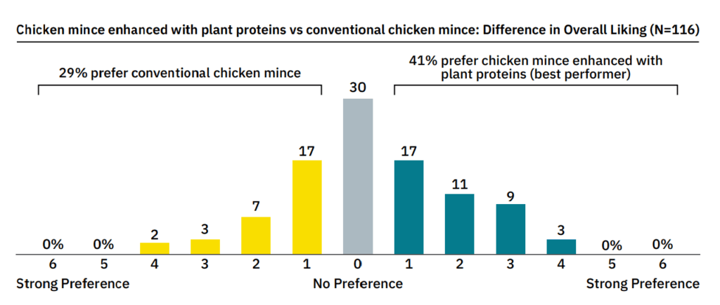 “Our analysis shows that enhancing animal meat with high-quality plant proteins can boost taste and broaden its appeal among local consumers. The fact that at least one enhanced meat product already outperforms its conventional counterpart suggests this nascent category is building on a very strong foundation, and greater R&D investment could propel it to new heights.”