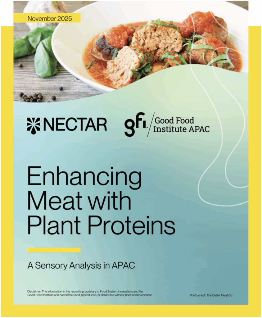 “Integrating plant proteins with conventional meat has the potential to enhance product nutrition, boost protein content, lower prices, and increase food-industry profit margins,” says report co-author and GFI APAC Head of Corporate Engagement Jennifer Morton. “Such products could also create a virtuous cycle in which plant-protein producers can rapidly scale up their manufacturing capacity, leverage economies of scale, drive down costs, and expand the accessibility of sustainable proteins, including fully plant-based products.”