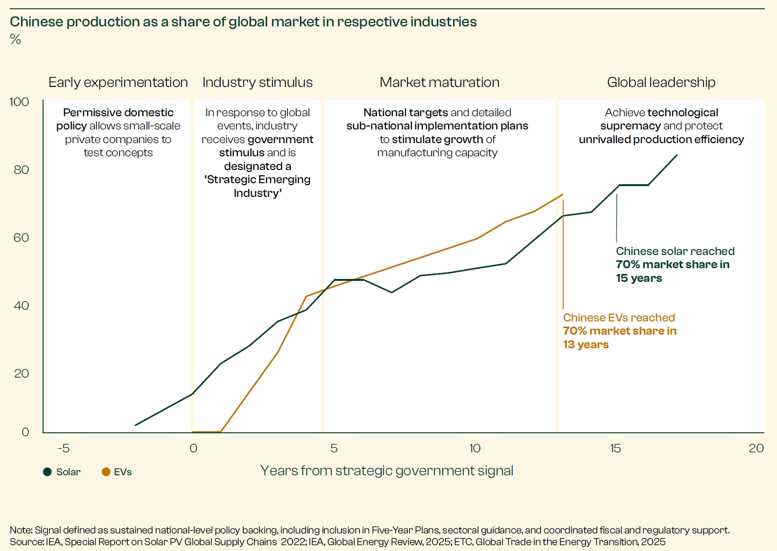Still, despite these early hurdles, the ripple impacts of China’s strategic investments may be evident sooner than you think. In both EVs and solar, the country went from zero to 70 percent of global production within 15 years.