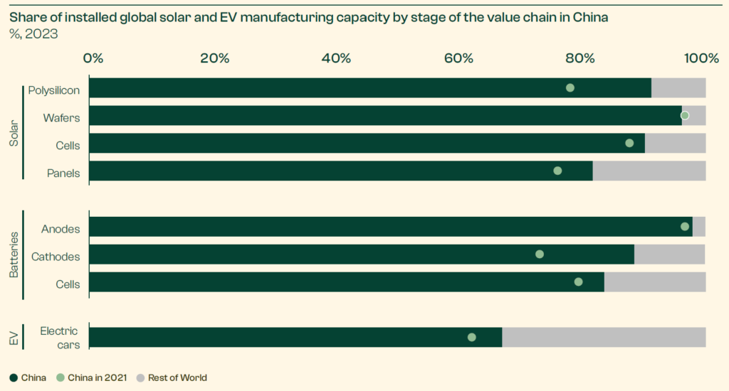 “Since 2015, global solar capacity has expanded more than 30-fold, with solar now supplying 7% of global electricity, and electric vehicle sales having increased 50-fold, reaching 20% of new vehicle sales globally in 2024,” Systemiq writes. “China sits at the centre of both transitions. By 2025, it accounted for approximately 80% of global solar manufacturing capacity and 70% of global EV production. Its role as the world’s largest manufacturer of these technologies extends deep into the value chain, where it is responsible for 80-95% of solar component manufacturing and 80-99% of battery component production.”