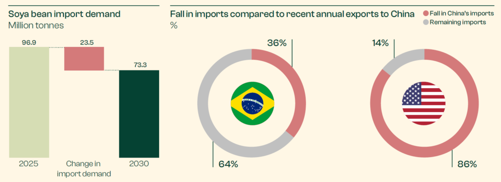By the end of this decade, Systemiq’s analysts project China’s investments in biotechnology and alternative proteins will reduce domestic imports of soybeans, which are primarily used for farmed-animal feed, by roughly a quarter—equivalent to nearly all of its current U.S. imports.