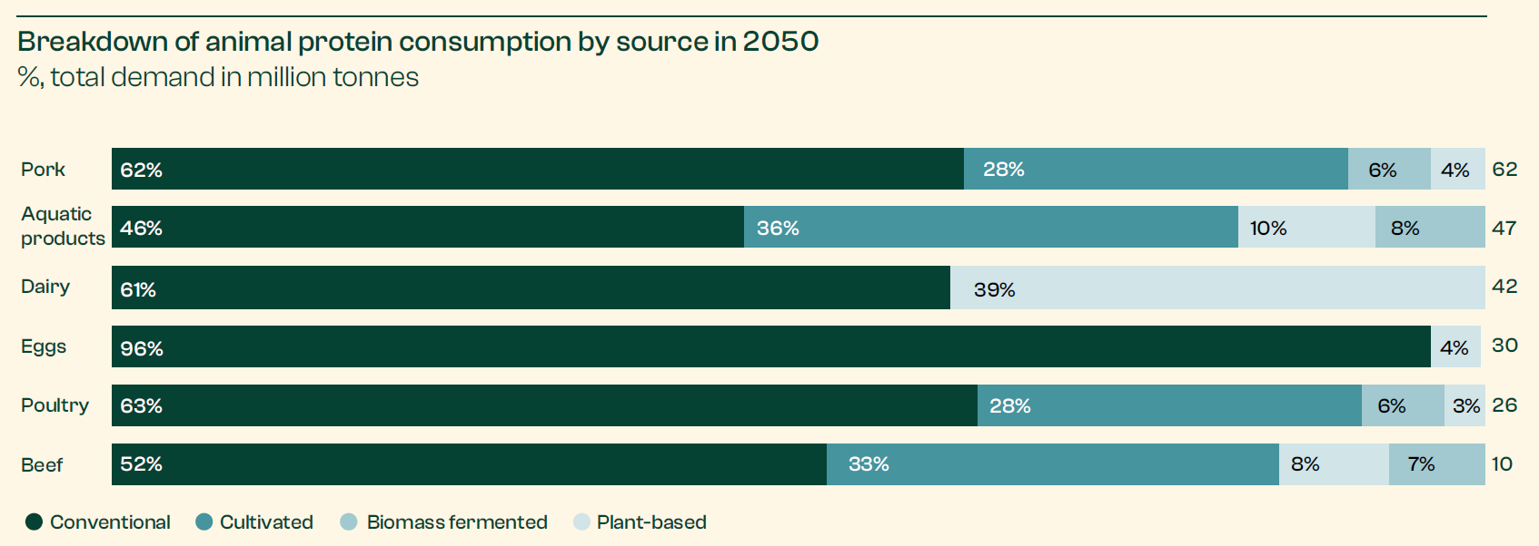 After decades of strategic R&D investments, Systemiq’s analysts believe cultivating meat directly from cells will become commercially viable, and alternative proteins will account for 35 – 55 percent of China’s total protein consumption, including 25 – 35 percent from cell cultivation. Plant-based and fermentation-derived ingredients will account for double-digit percentages on top of that, resulting in a colossal drop in conventional meat production and consumption.