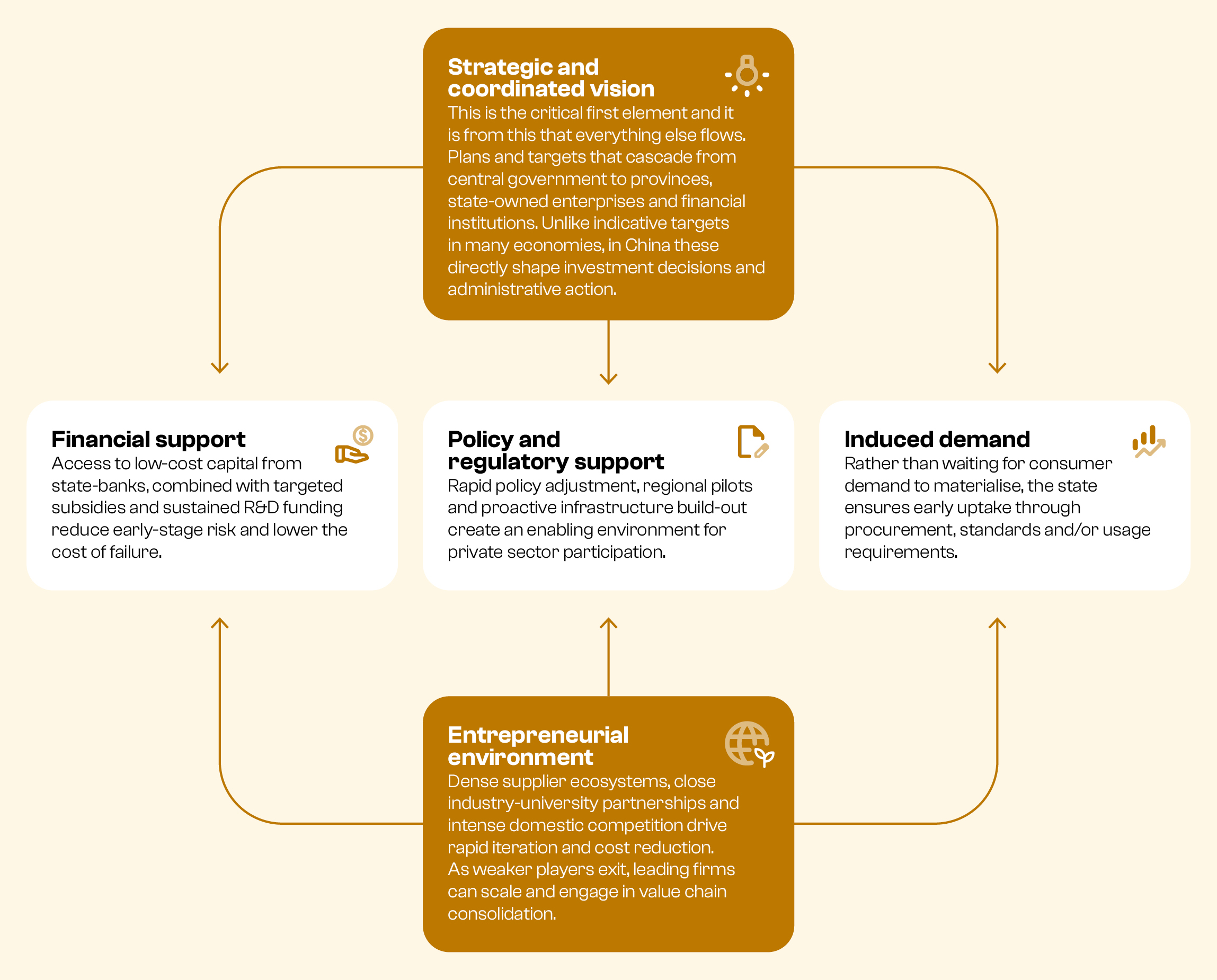 The authors took a particularly close look at China’s embrace of solar energy and EV batteries, and charted how those sectors were transformed in the decades after their respective “Year 0” moments. In each case, China utilised a playbook of “mutually reinforcing success factors,” including a coordinated national vision, financial support, induced demand, and enabling policy and regulatory support.
